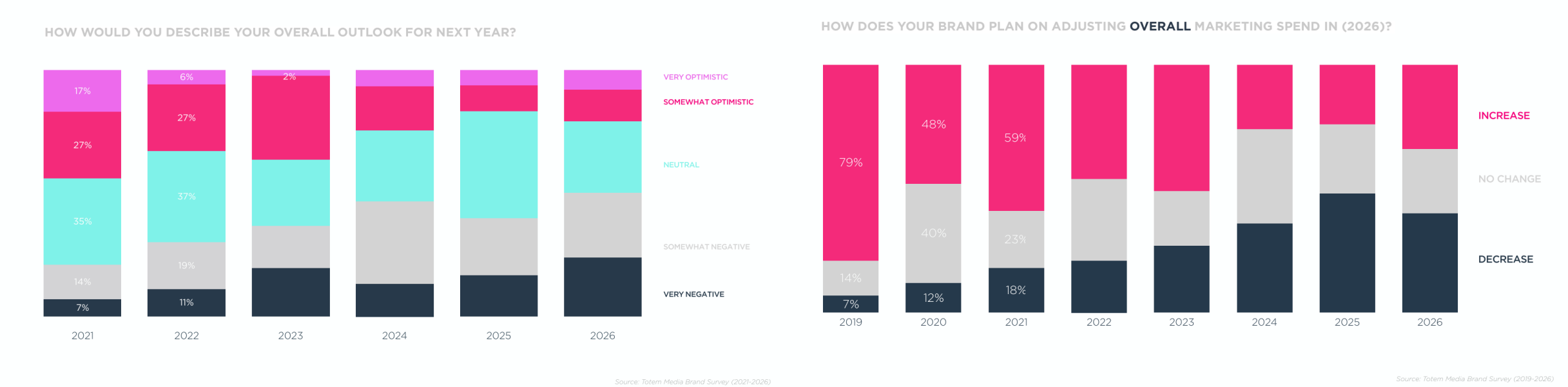 Among the marketers who participated in the survey, almost half describe the overall outlook for next year as “somewhat negative” or “very negative”, the highest rates over the past few years. In contrast, the percentages of marketers who ticked “very optimistic” and “somewhat optimistic” are also higher than the previous year. Meanwhile, more marketers are expected to increase their overall marketing spend in 2026, with fewer planning to decrease it compared to last year’s data.