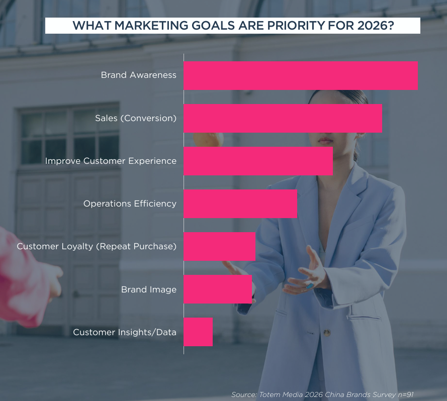 The primary marketing priorities for 2026, according to Totem, are brand awareness, sales (conversion), and improving customer experience. For the first time in many years, brand awareness has re‑emerged as a top priority for marketers in China, outpacing sales (conversion). According to the 2025 report, brand awareness had already overtaken customer loyalty (repeat purchases) as the second priority. However, in 2026, customer loyalty has fallen much further down to fifth place on the list of priorities.