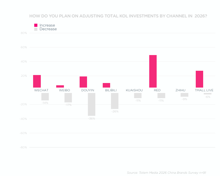 For influencers (KOLs), in year’s past, planned increases outpaced cuts by a factor of 2-3x. However, for 2026, only Xiaohongshu and Tmall Live are projected to have increases that surpass their respective cuts. According to the survey results, KOL activities for 2026 seem to be focusing on Xiaohongshu and Tmall Live, at the expense of other channels.