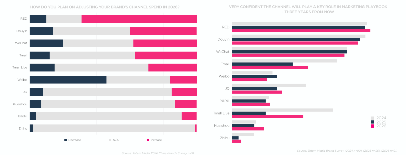 In terms of platforms in China, in recent years, RedNote (Xiaohongshu) has emerged as the leading platform in China for brands looking to drive new spending. Douyin ranks second, positioning itself as a key target for brand investments through 2026. WeChat, Tmall, Tmall Live, and Weibo are mature channels that show a strong willingness for investment from brands, according to this year’s survey results. JD and Kuaishou have also demonstrated positive growth in 2025 and are expected to gain increased attention in 2026. BiliBili and Zhihu are considered niche channels , which are highly effective for brands within specific sectors, with BiliBili for gaming and media, and Zhihu for professional services.